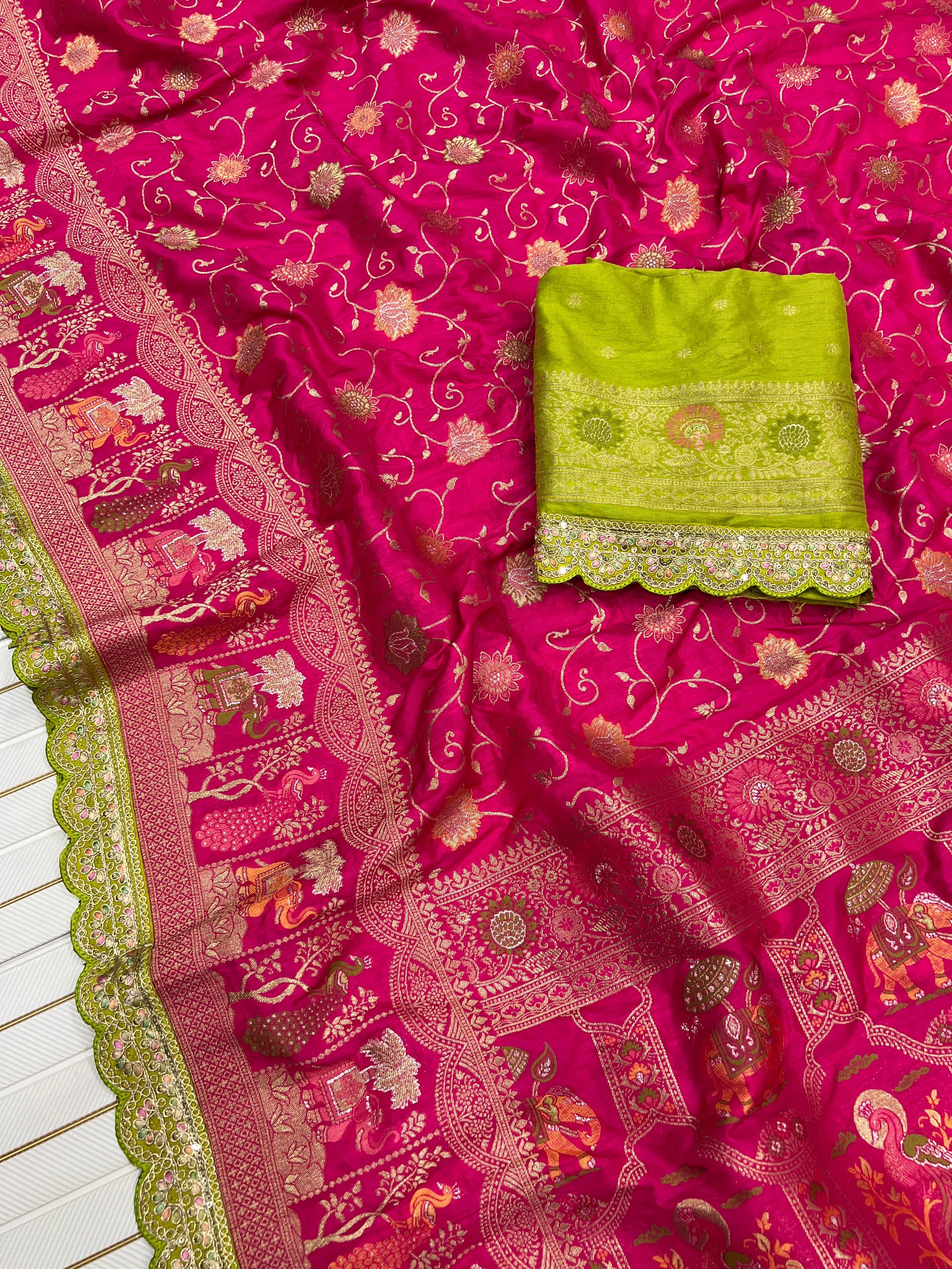 Drape yourself in timeless elegance with this exquisite Rani Pink Banarasi Silk Saree, featuring intricate golden zari weaving and rich traditional motifs. The saree is adorned with finely detailed floral vines, peacocks, and royal elephant designs across the border and pallu, making it a true masterpiece of craftsmanship. Paired with a contrasting lime green blouse embellished with zari and scalloped edging, this saree is a perfect choice for weddings, festive occasions, and grand celebrations.