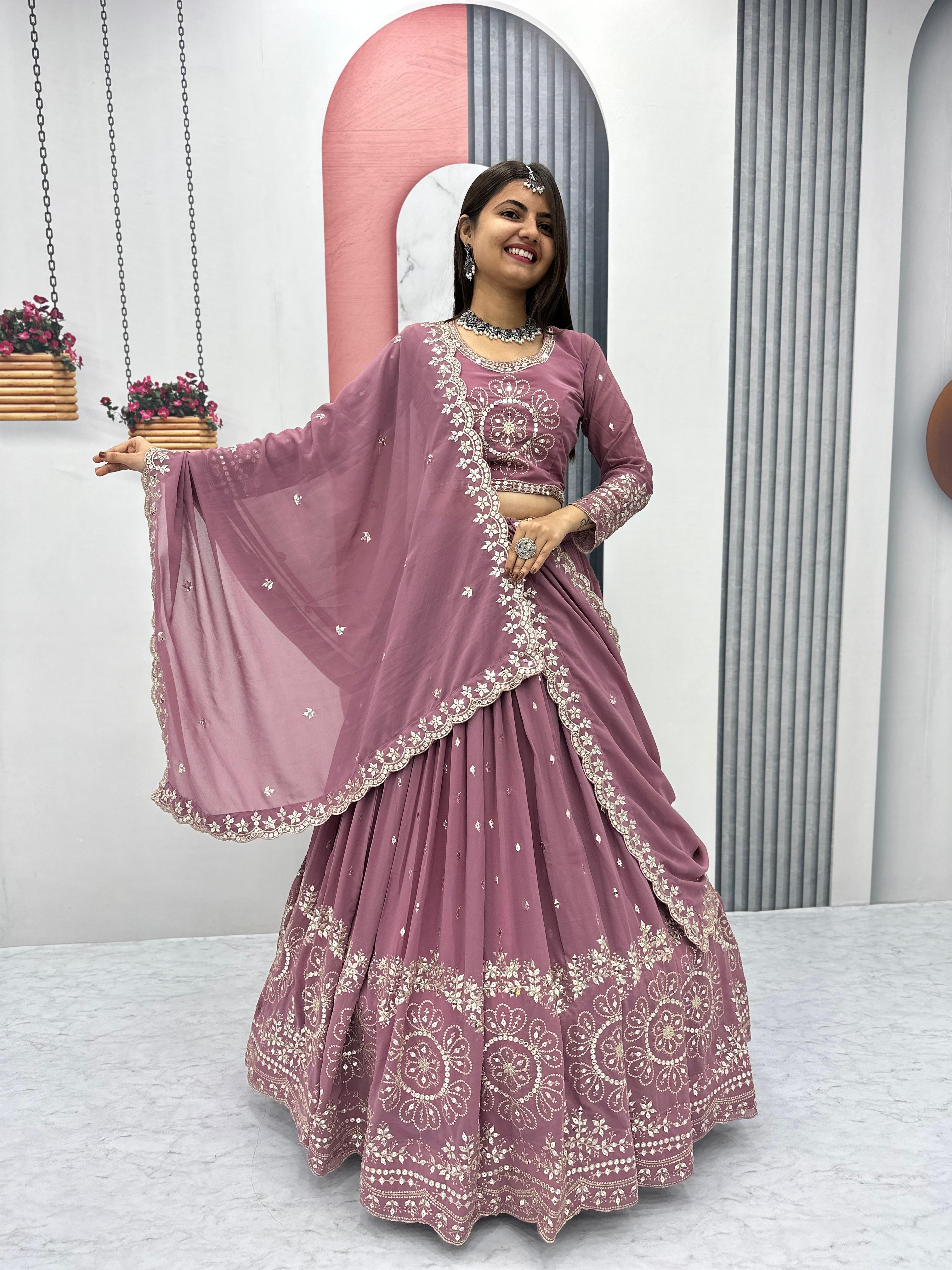 This georgette lehenga choli features intricate sequence work, making it the perfect choice for any festive occasion. The lightweight and breathable fabric ensures comfort while the stunning design adds a touch of elegance to your ensemble. Upgrade your festive wardrobe with this beautifull lehenga choli.