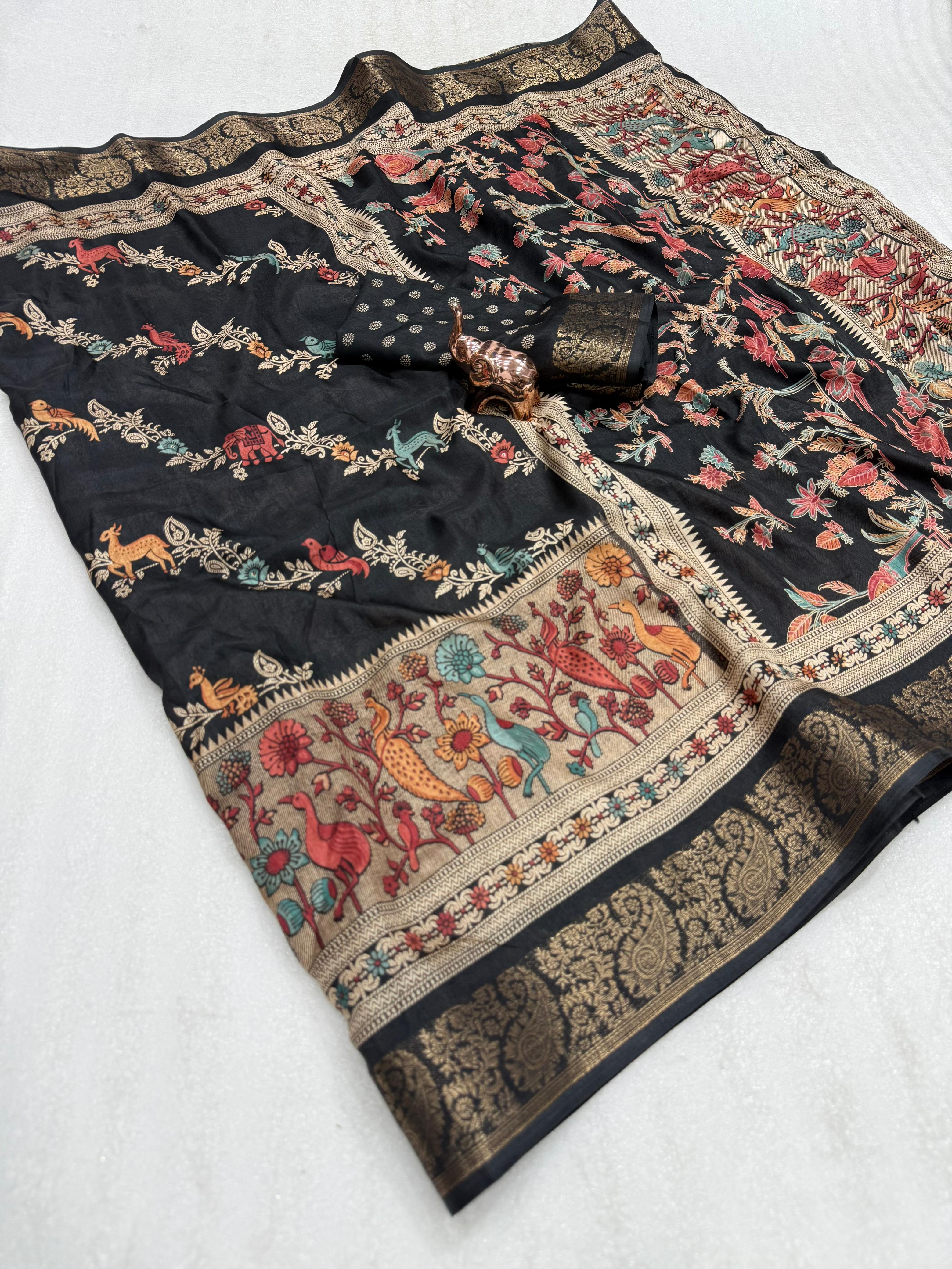 Elevate your ethnic wardrobe with this stunning black silk saree, featuring intricate animal and floral handloom designs. Crafted with precision, the saree showcases colorful motifs of birds, elephants, and deer, symbolizing nature’s beauty and tradition.