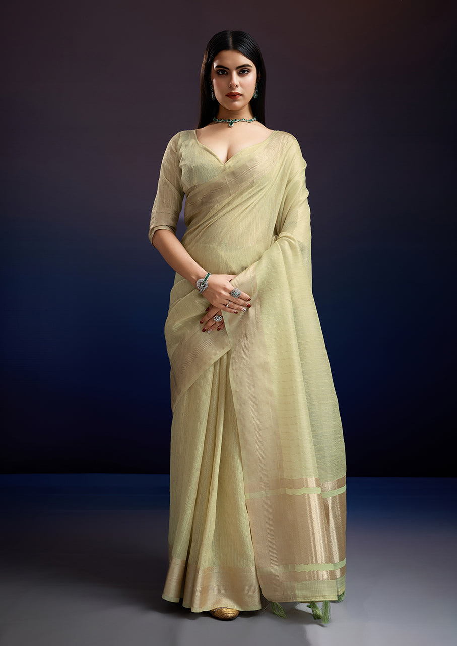 This pastel green silk saree provides a soothing, breathable drape that feels light on the skin. Crafted with care, it features a subtle zari border for a touch of shine, making it perfect for both traditional and contemporary settings. Perfect as a joyful wear saree or a downplayed wedding saree, this handwoven silk saree integrates convenience with beauty. A refined choice for those who appreciate traditional Indian sarees with a touch of stylish simplicity.