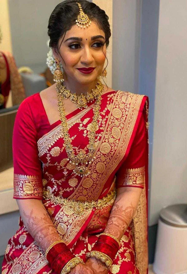 This Flam Red Zari Work Banarasi Silk Saree exudes elegance and sophistication. Made from high-quality silk and adorned with intricate zari work, it is a perfect choice for any special occasion. The vibrant red color adds a touch of boldness and the traditional banarasi weave showcases the rich heritage of Indian sarees. Elevate your style with this exquisite piece.