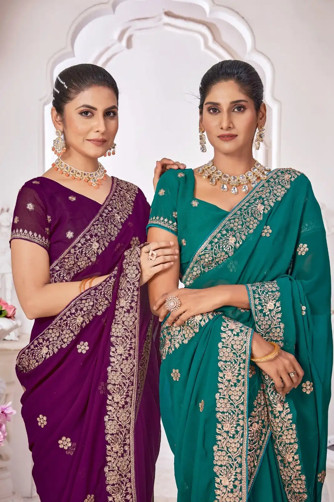 JAYSHREE sarees crafted from premium georgette fabric showcase delicate blooming patterns that enhance their sophisticated appeal. The lightweight material ensures a graceful drape and comfortable wear, suitable for various occasions. Expertly designed, these sarees combine traditional artistry with modern elegance, making them a refined choice for discerning customers.