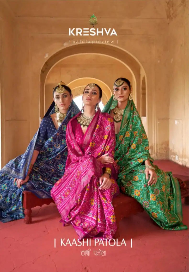 KRESHVA Sarees showcase exquisite craftsmanship using Super P.V. Silk 8001, renowned for its smooth texture and durability. This saree features a traditional Patola design, enriched with delicate stud work and finished with a protective epoxy coating, ensuring both elegance and longevity. Perfect for connoisseurs seeking a blend of heritage artistry and premium quality.