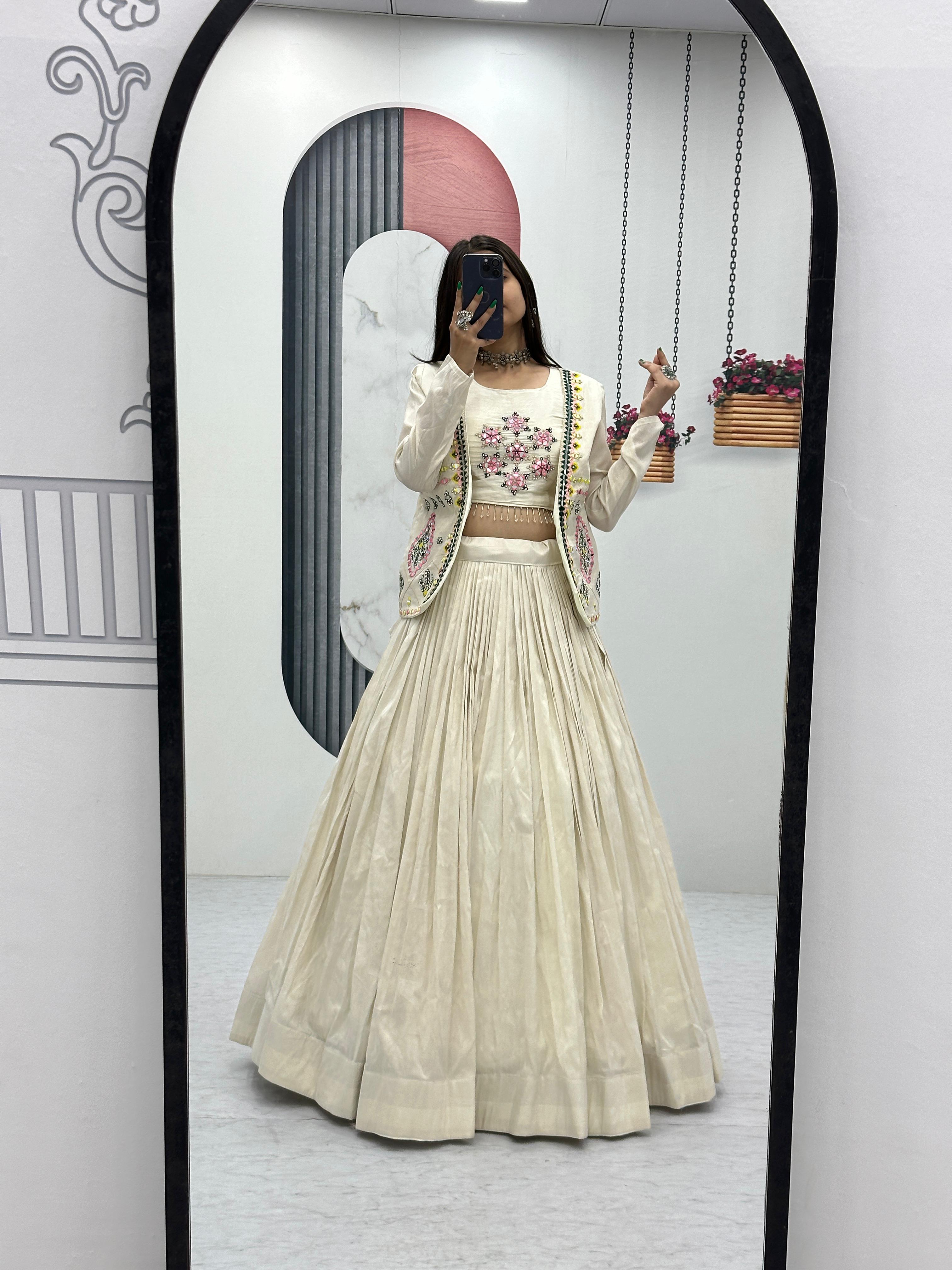 Enhance your traditional wardrobe with the Prisha Creation Beige Embroidered Anarkali Dress, featuring detailed floral embroidery on the front and back. The elegant beige color with pleated detailing uses a graceful silhouette, while the matching embroidered jacket adds a contemporary touch to the timeless Anarkali design.