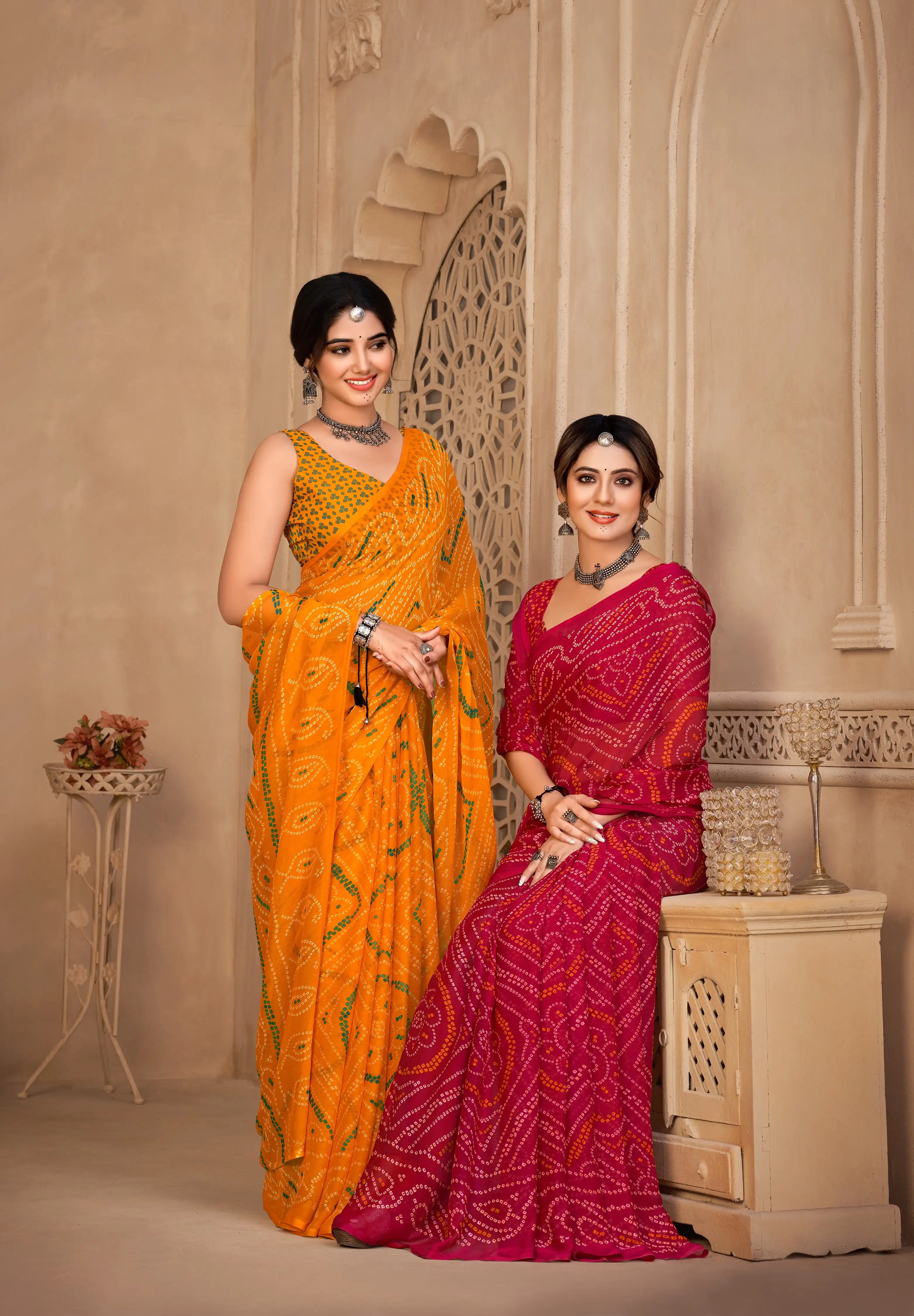 Ruchi Sarees with Chiffon Bandhni combine traditional craftsmanship with elegant fabric choice. The lightweight chiffon enhances comfort and drape, while the intricate Bandhni tie-dye patterns add a timeless, artisanal appeal. Ideal for festive occasions and formal events, these sarees offer a refined look that reflects expert artistry and cultural heritage.
