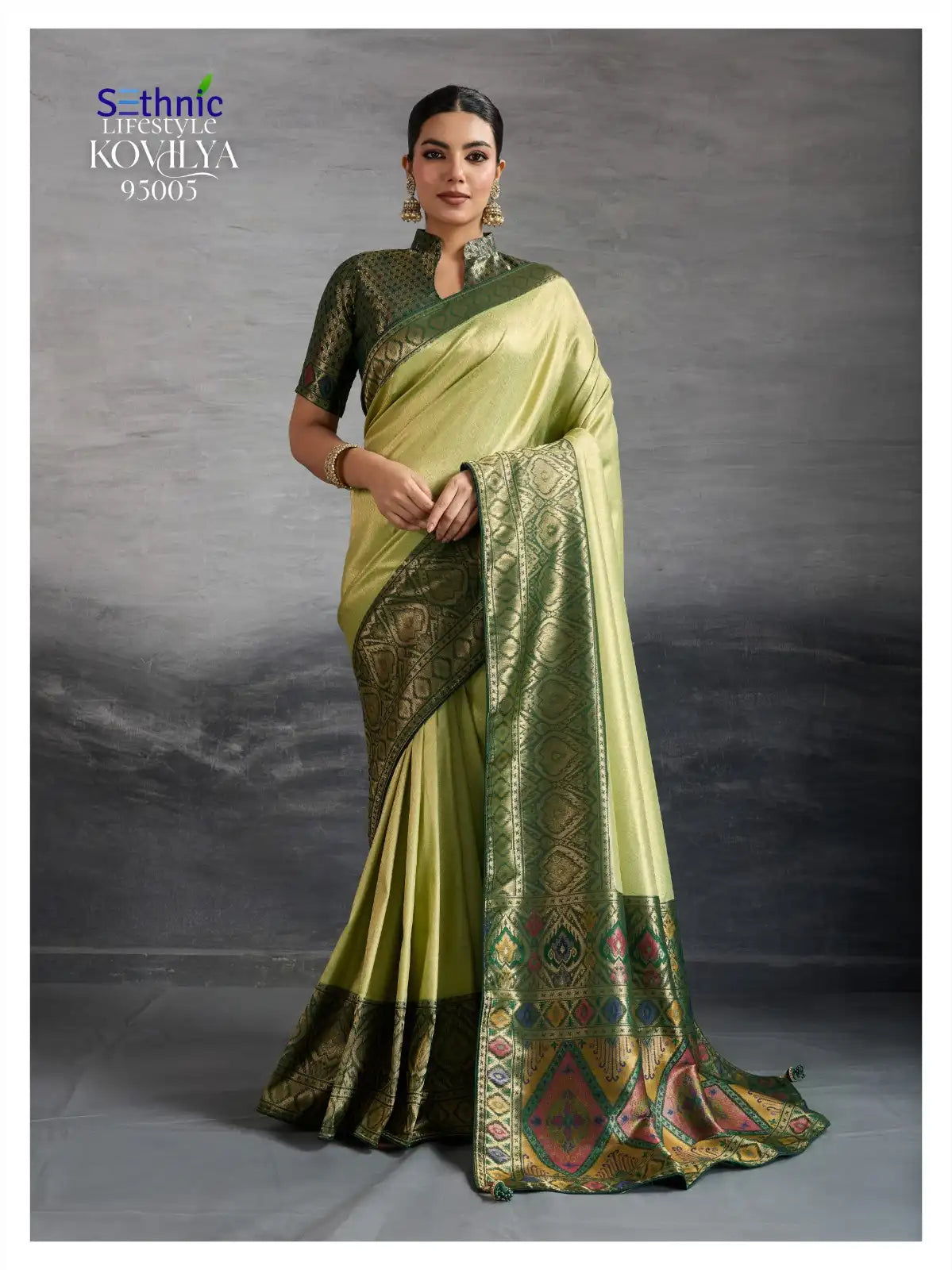 Sethnic LifeStyle sarees are crafted from premium Kanjivaram soft silk, featuring the distinctive Kadiyal pattern that highlights traditional artistry. The double zari woven patta enhances the saree’s richness, while the Meenakari woven pallu adds intricate detailing, reflecting expert craftsmanship. Ideal for formal events and cultural occasions, this saree offers a blend of luxurious texture and timeless elegance.