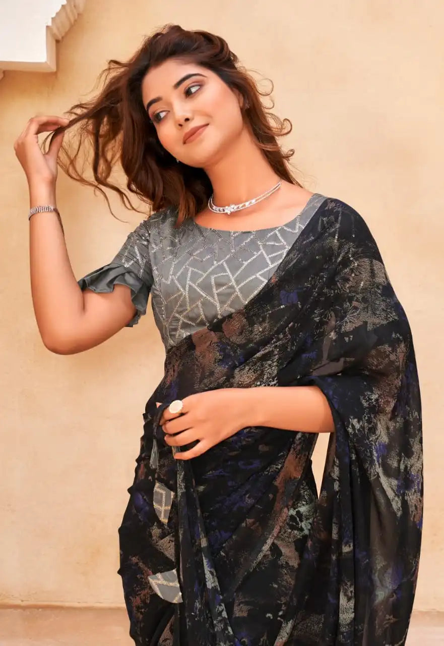 Stavan Sarees crafted from elegant fancy chiffon fabric offer a lightweight and graceful drape, perfect for formal occasions. Paired with an intricately embroidered blouse, this ensemble combines delicate craftsmanship with sophisticated style, ensuring a refined and polished look. Ideal for those seeking both comfort and elegance in traditional wear.