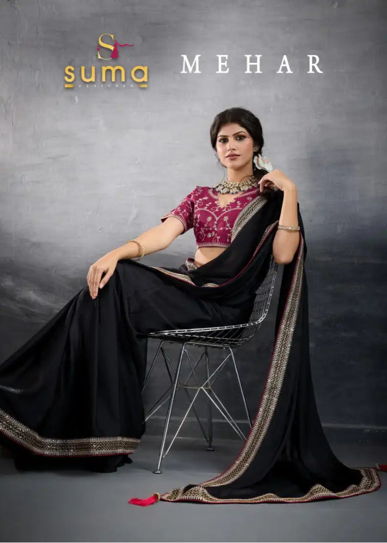 Suma Designer Sarees crafted from premium Star Georgette fabric offer a luxurious drape combined with exceptional comfort. Featuring a heavy border, these sarees enhance elegance and provide a striking contrast that highlights intricate craftsmanship. Ideal for formal occasions, the lightweight yet durable material ensures ease of wear while maintaining a sophisticated appearance. Perfect for those seeking a blend of traditional charm and contemporary style.